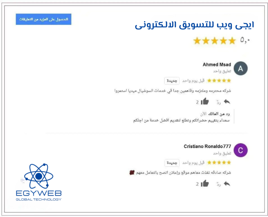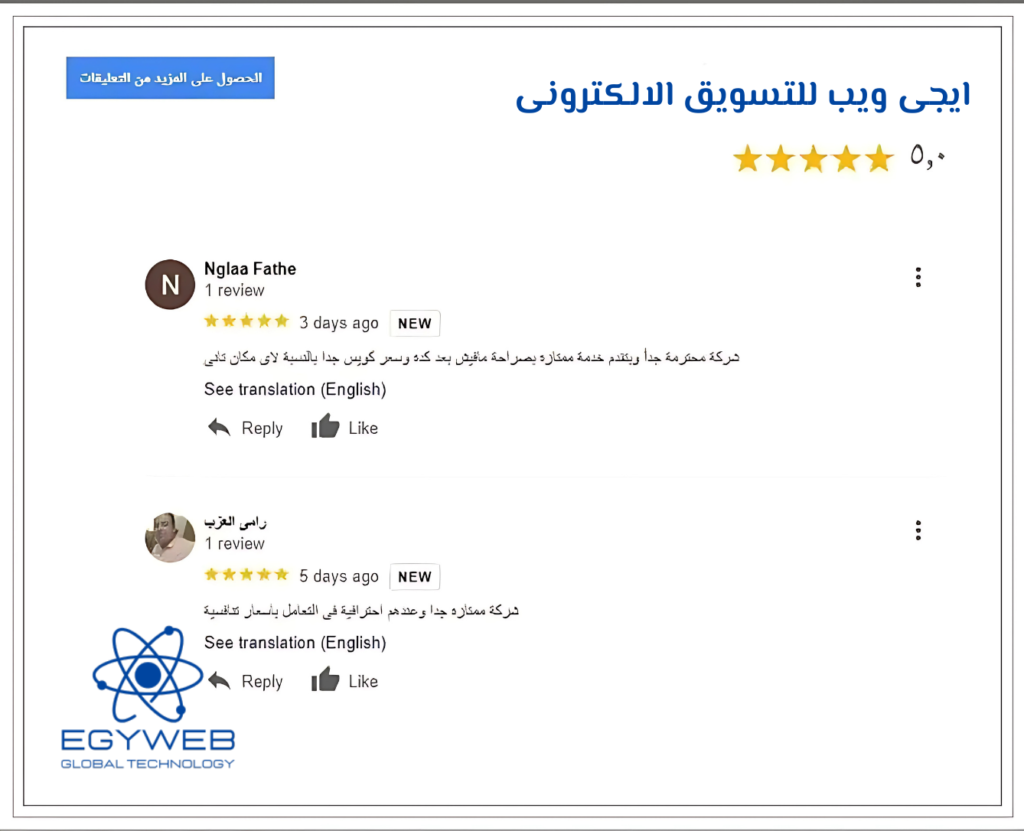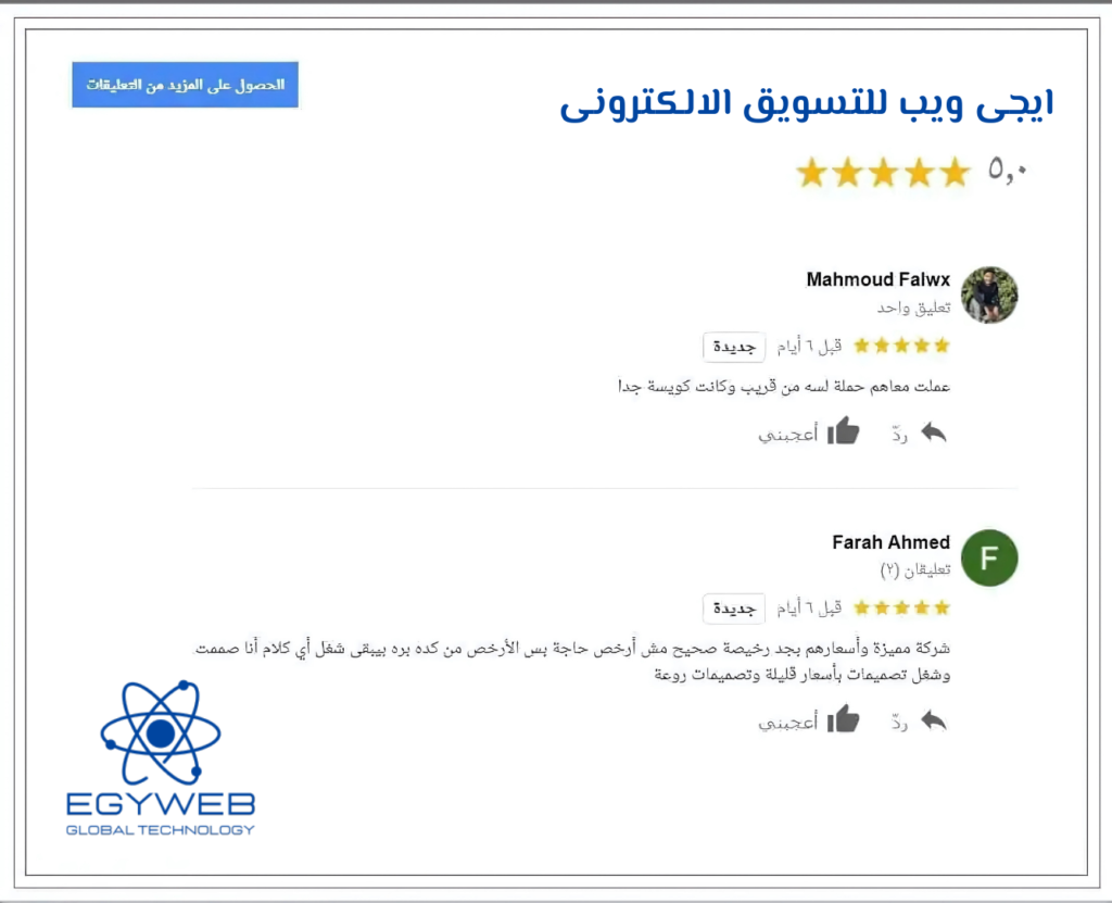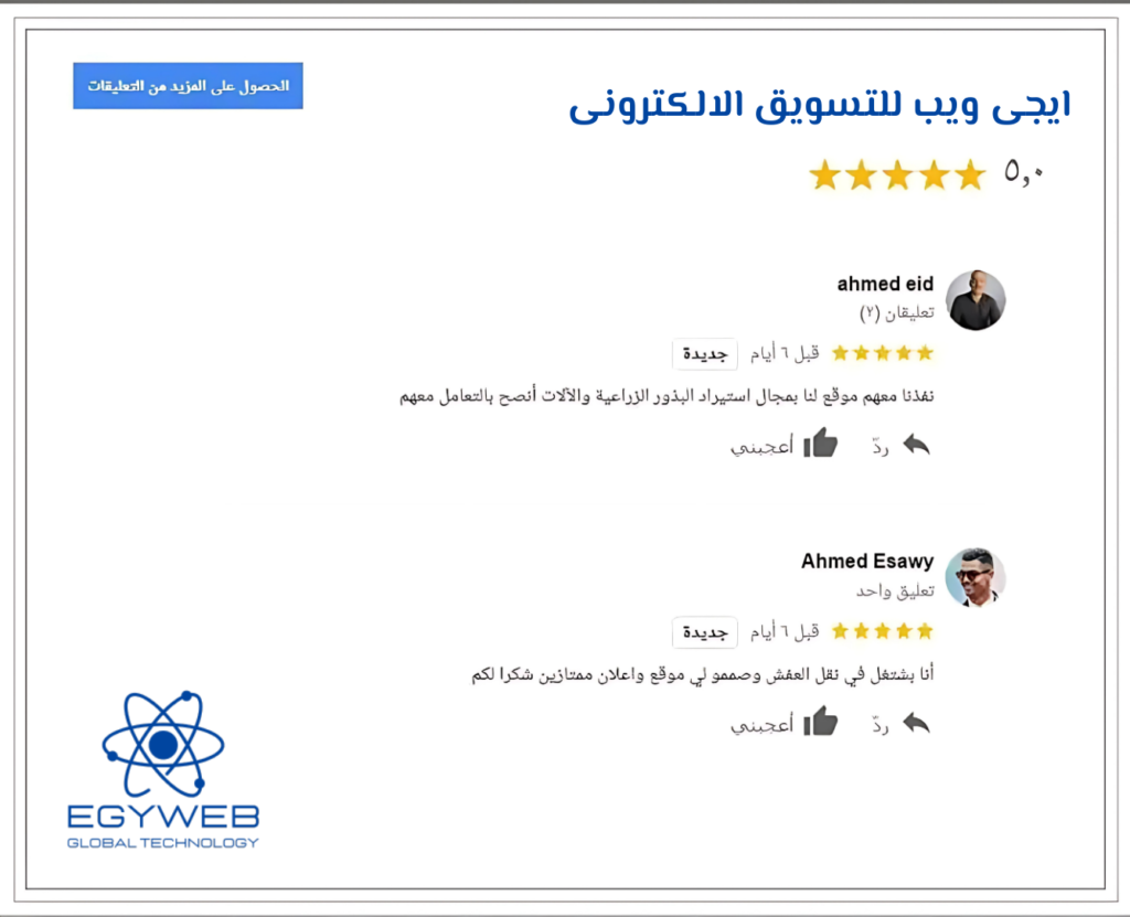 نحن في ايجى ويب نمتلك فريقًا من الخبراء والمتخصصين في مختلف مجالات التصميم والتسويق، ونحن على دراية تامة برغبات واحتياجات العميل. لدينا سجل حافل من الأعمال المميزة يمكنك الاطلاع عليه للتأكد من جودة خدماتنا.