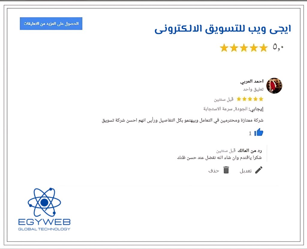 في ايجى ويب ، نعمل بجهد لضمان أن التصميمات تفي بتوقعات العميل بالضبط. يمكنك معاينة أعمالنا السابقة قبل الاتفاق والشراء، مما يتيح لك فرصة لتقييم جودتها ومدى تناسبها مع ذوقك الشخصي. بالإضافة إلى ذلك، نحن نقدم ضمان استرداد الأموال في حالة عدم الرضا، ولكن يتم ذلك وفقًا لبنود وشروط الخدمة.
